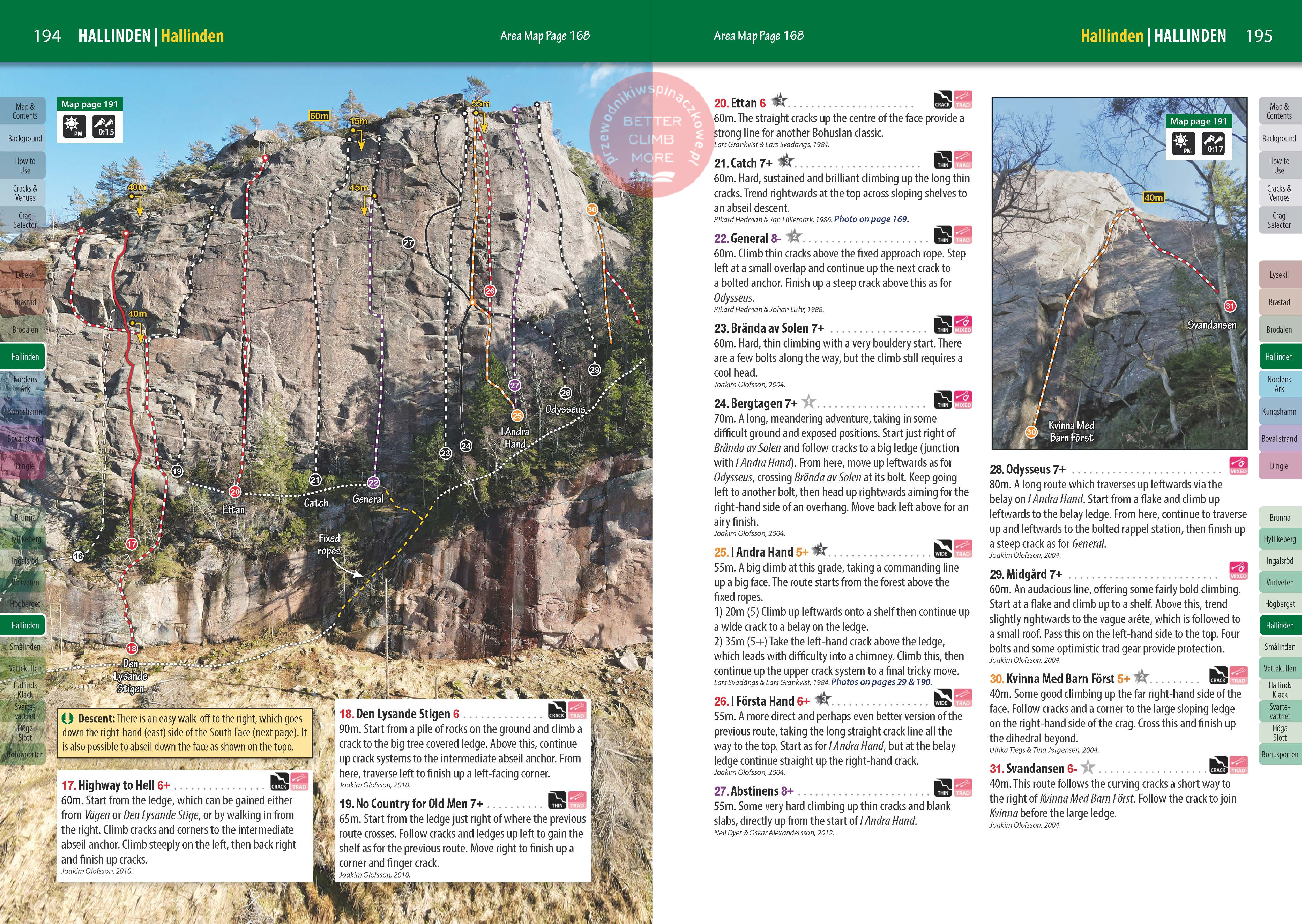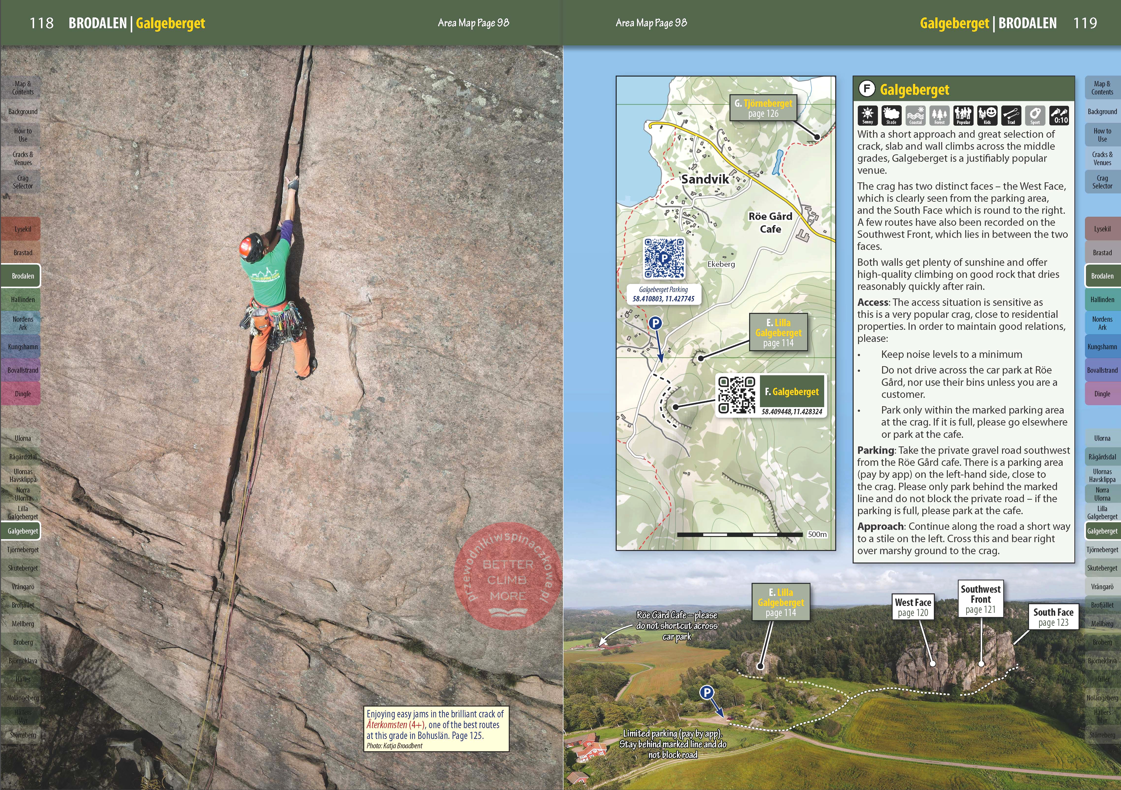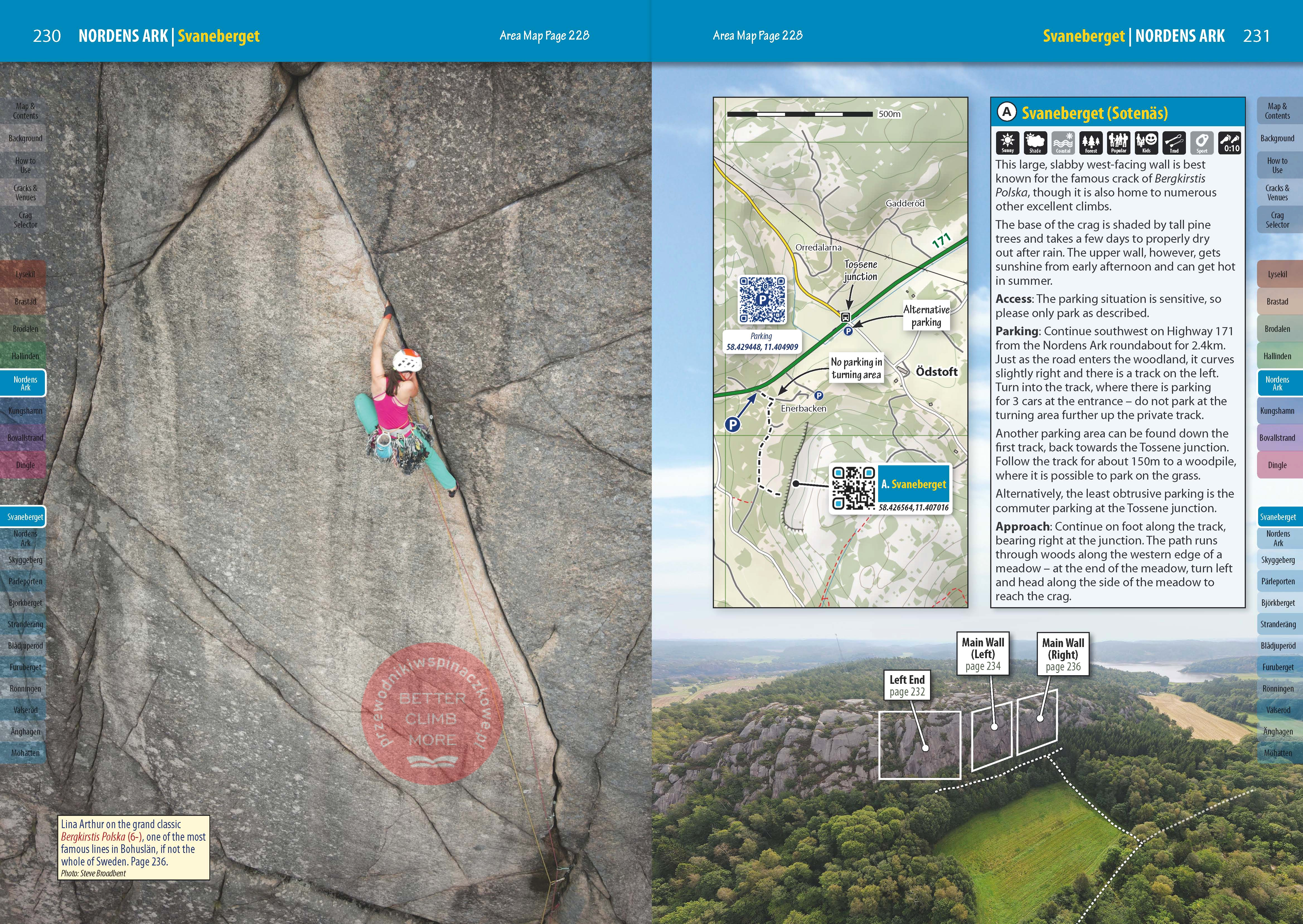Wszystkie linie są przedstawione na kolorowych zdjęciach wraz z krótkim opisem. Każda skałka ma opis rodzaju wspinania, informacje o podejściu, bardzo szczegółowe mapy i zdjęcie poglądowe sektoru. Oczywiście zie zabrakło kodów QR wskazujących najbliższy parking oraz dokładne położenie danej skałki. Całość uzupełniają informacje praktyczne: , w tym szczegóły dotyczące najlepszego terminu wizyty, miejsc noclegowych, dojazdu oraz co ciekawego można zaplanować na dni restowe. Wisienką na torcie jest tabelka „Crag Selector” ułatwiająca wybór najlepszego rejonu na podstawie różnych kryteriów.