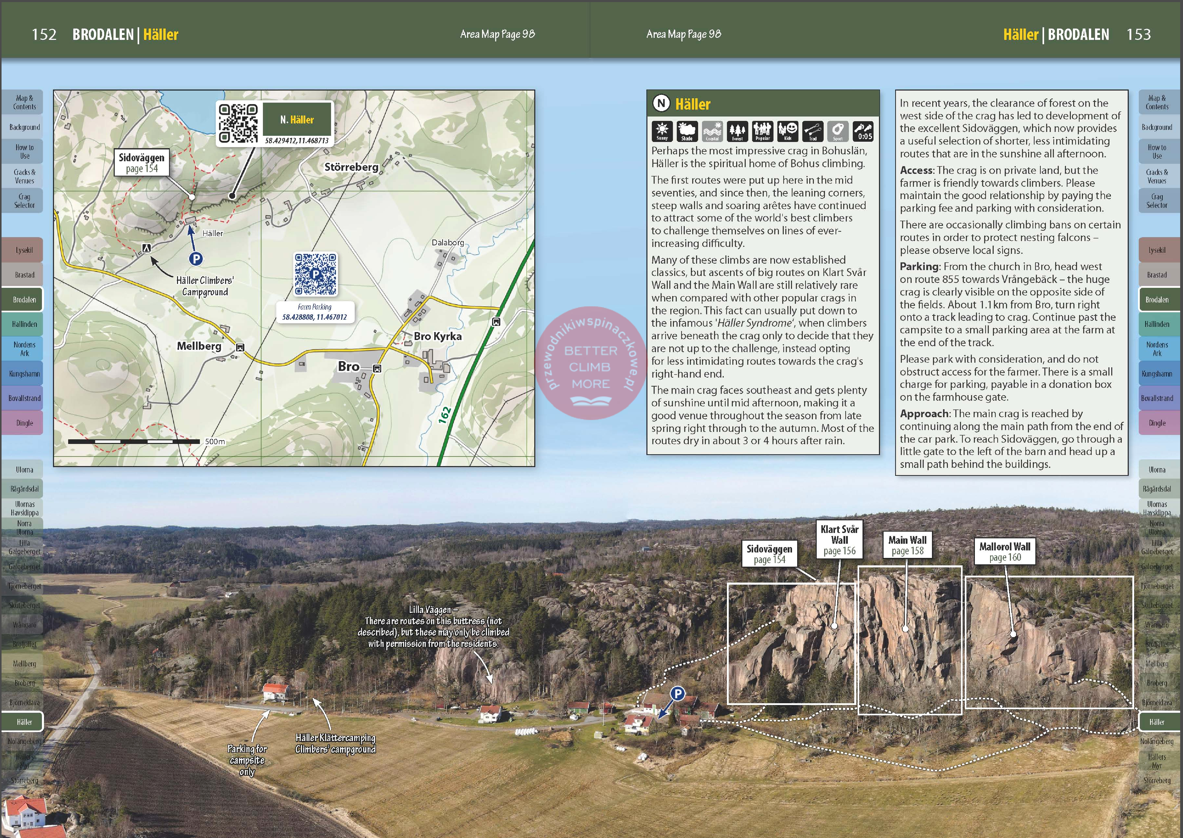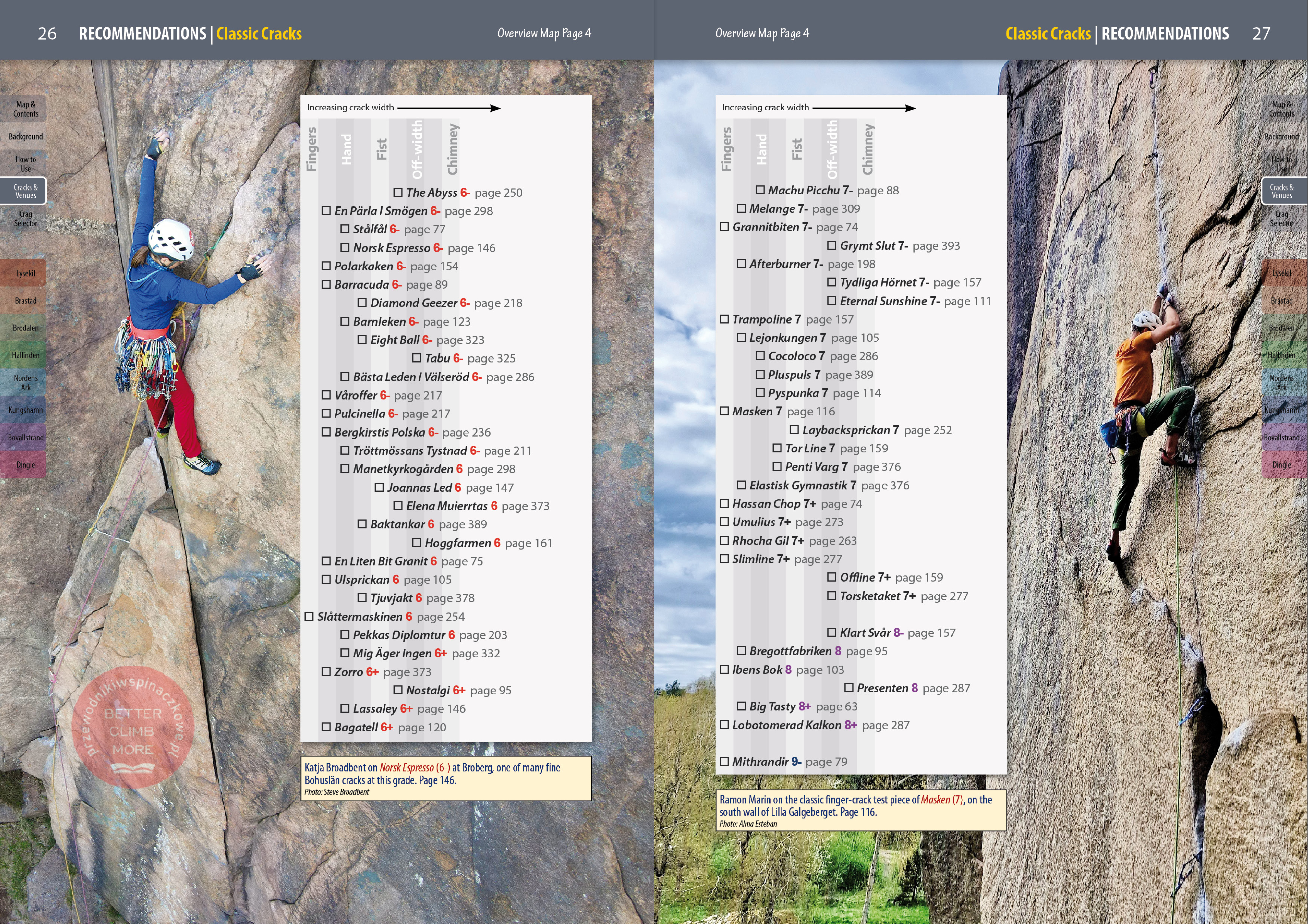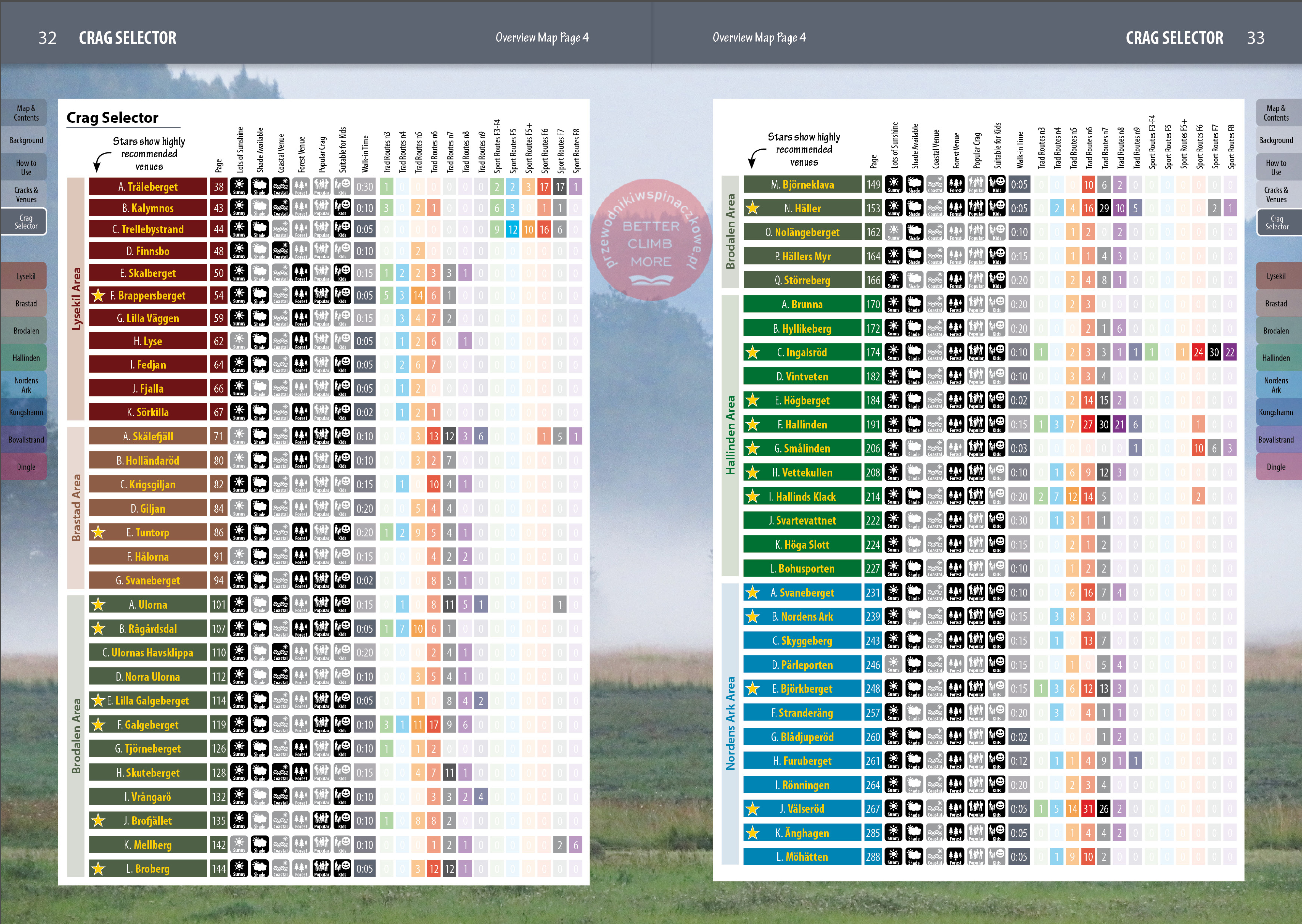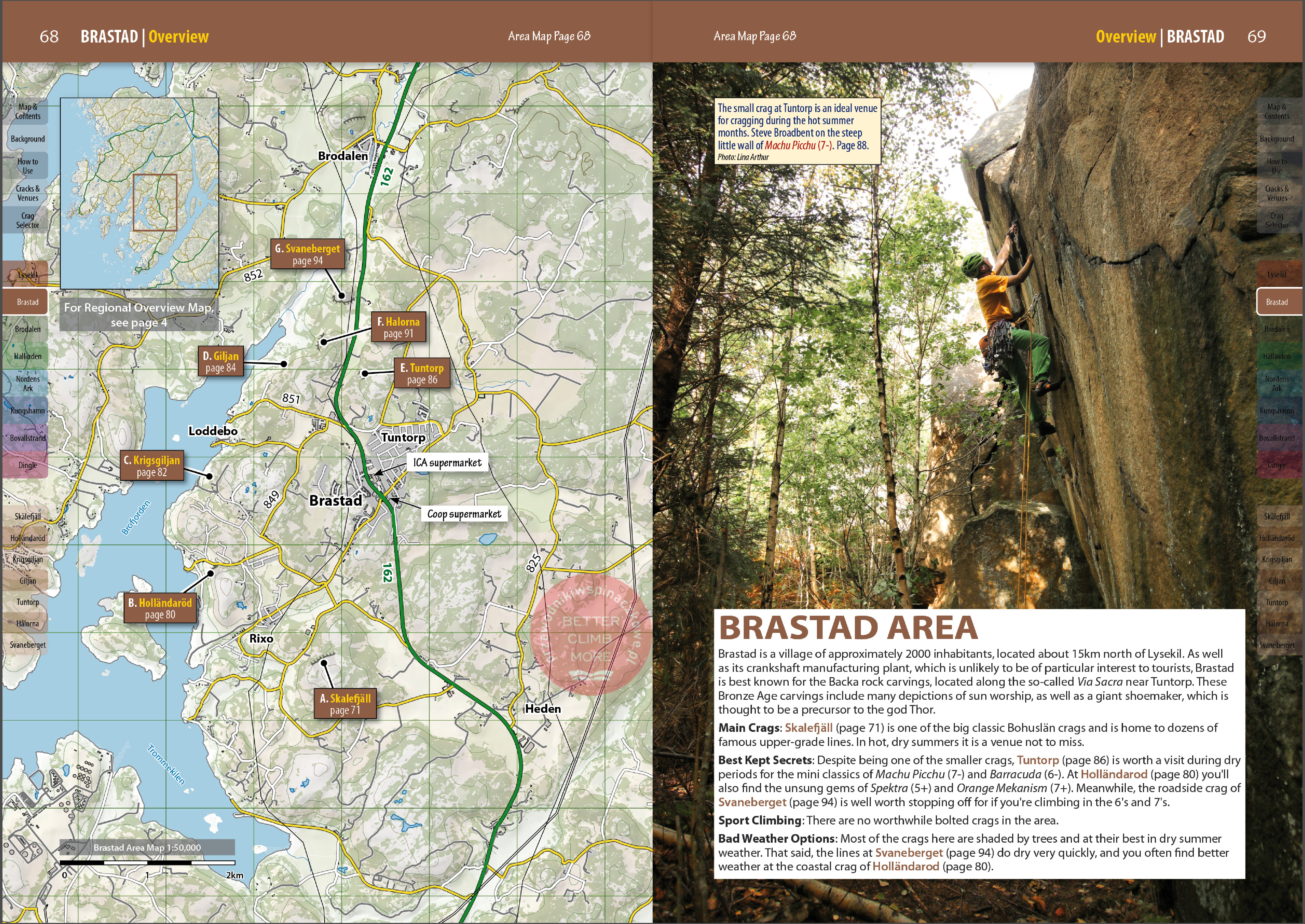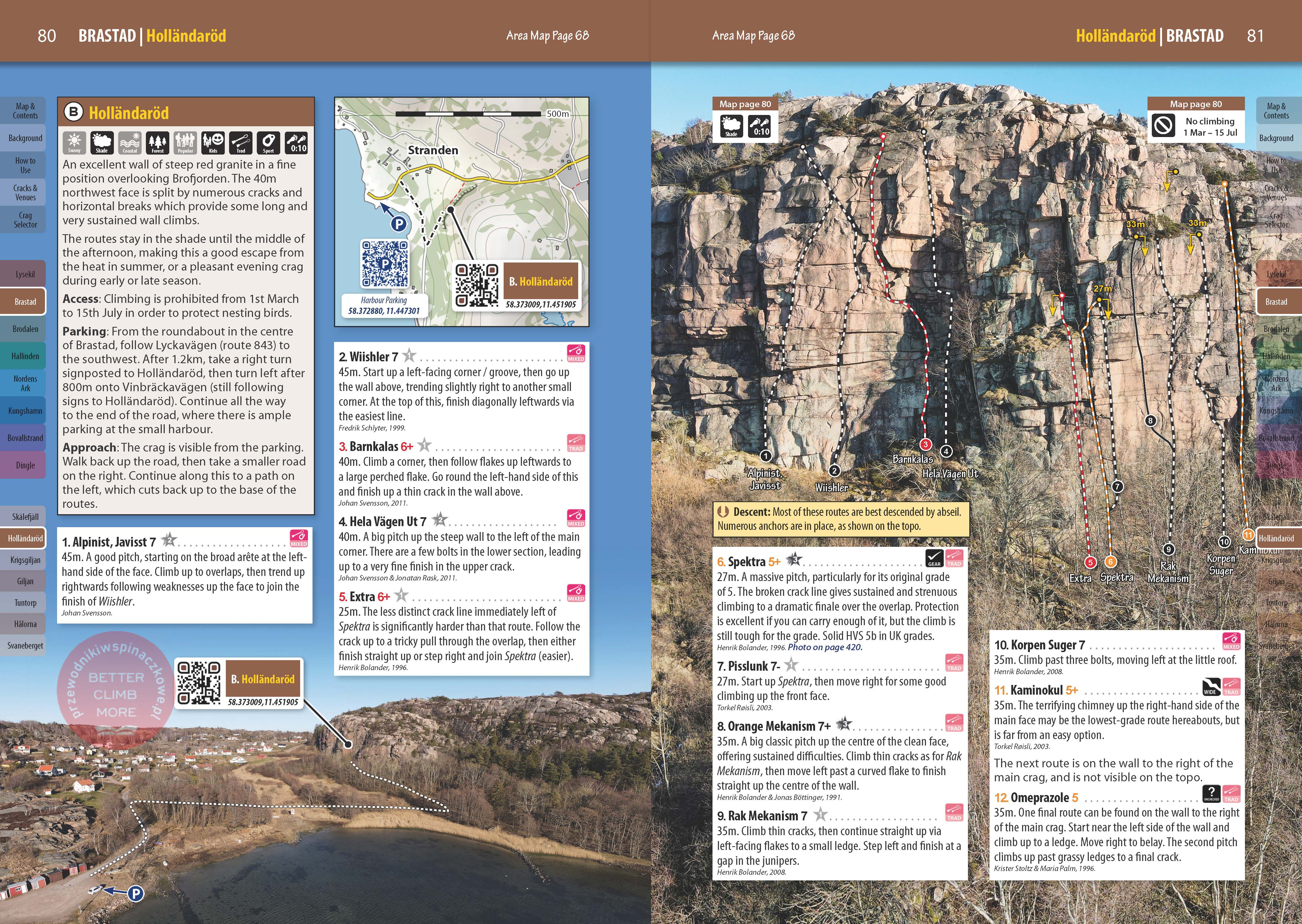 Przewodnik Bohuslän Selected Rock Climbs opisuje łącznie 1800 dróg: 1500 dróg na własnej asekuracji oraz 300 w pełni obitych dróg sportowych, rozmieszczonych w 91 najlepszych rejonach.
