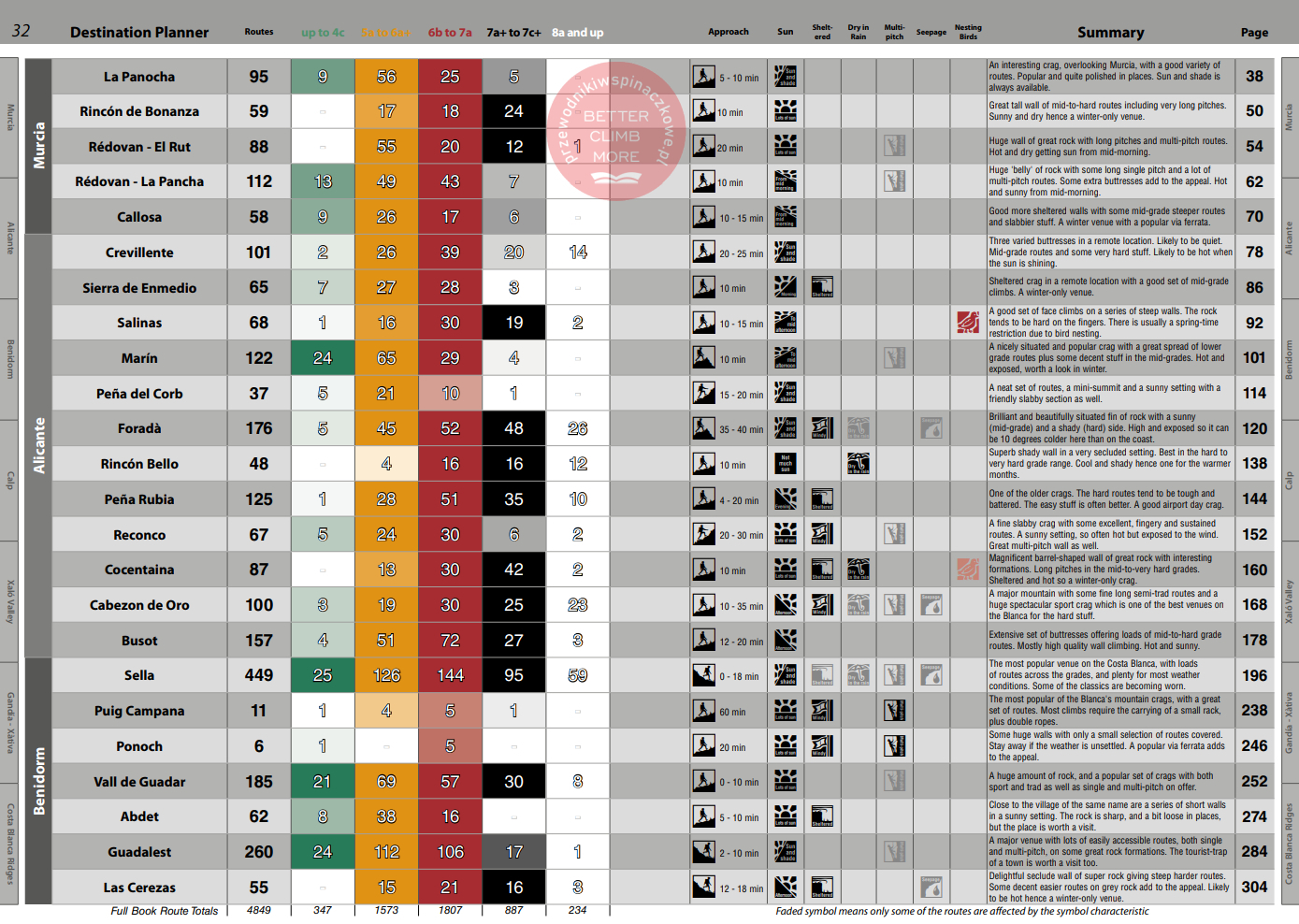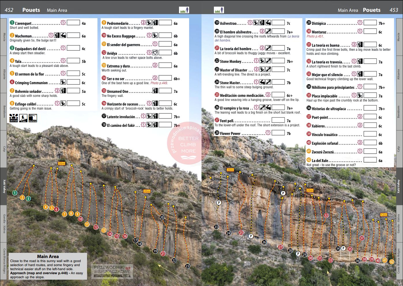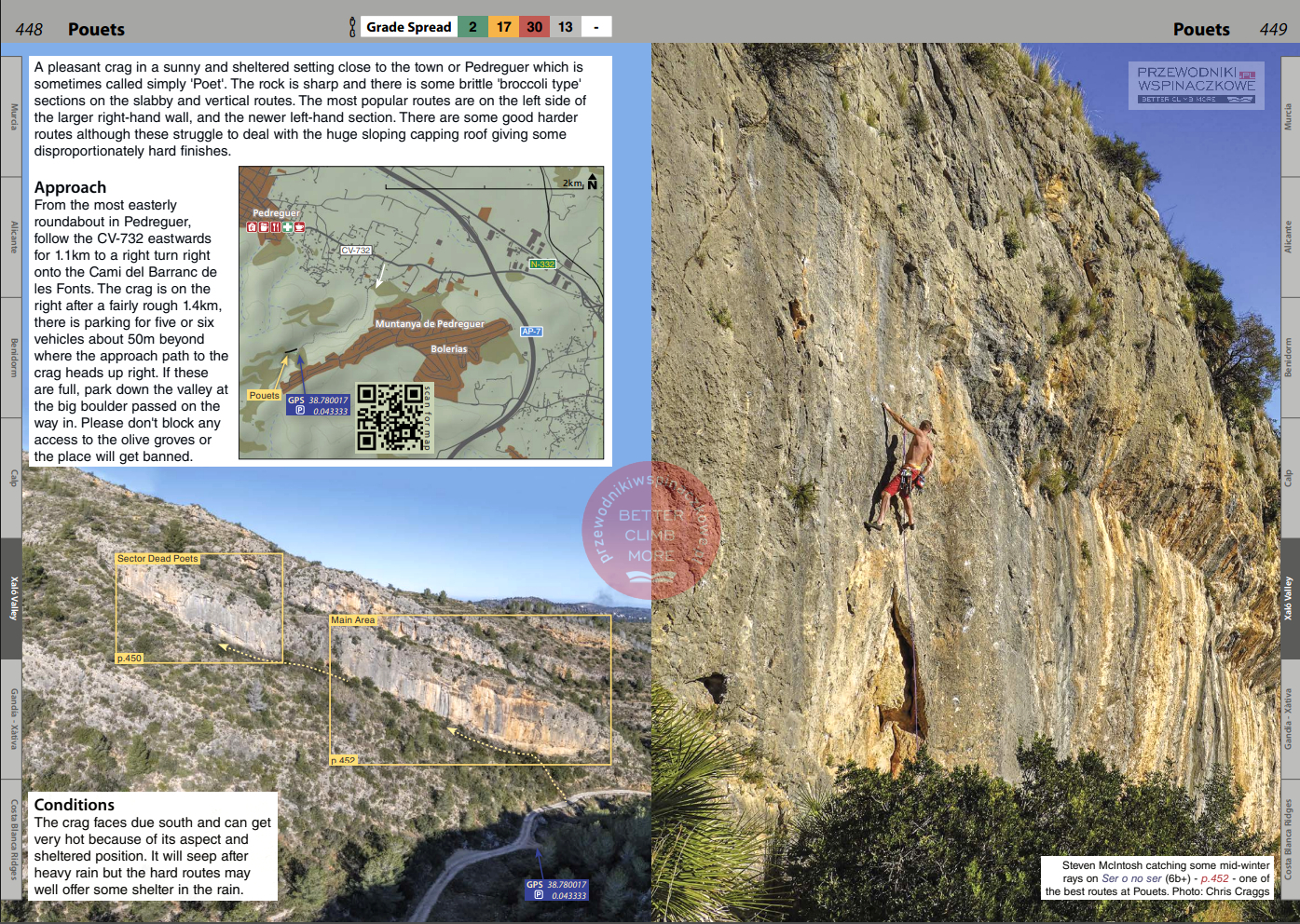 Łącznie w przewodniku opisano 4800 dróg wspinaczkowych w pełnym zakresie trudności rozsianych w 50 odrębnych sektorach. Dodatkowo przewodnik opisuje również 4 klasyczne już graniówki (w tym najsłynniejszą granię Bernia), które mogą być świetną propozycją dla niewspinających się partnerów lub, po prostu, na dzień restowy.