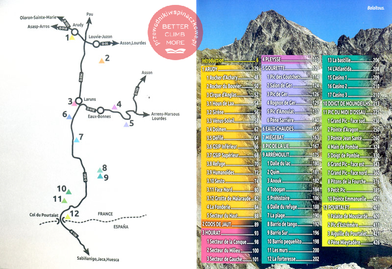 Vallée d'Ossau to jedna najbardziej turystycznych dolin francuskich, a wieńczący ją szczyt Midi d'Ossau jest symbolem Pirenejów zarówno dla wspinaczy, jak i alpinistów. Znajdziemy tu wszystko, czego pragnie dusza wspinacza: od wspinania sportowego na nisko położonych skałkach otoczonych bujnymi, górskimi łąkami, aż po 800-metrowe drogi w wysokogórskim otoczeniu. Wspinaniu wielowyciągowemu, jak i jednowyciągom poświęcono mniej więcej równe części przewodnika.