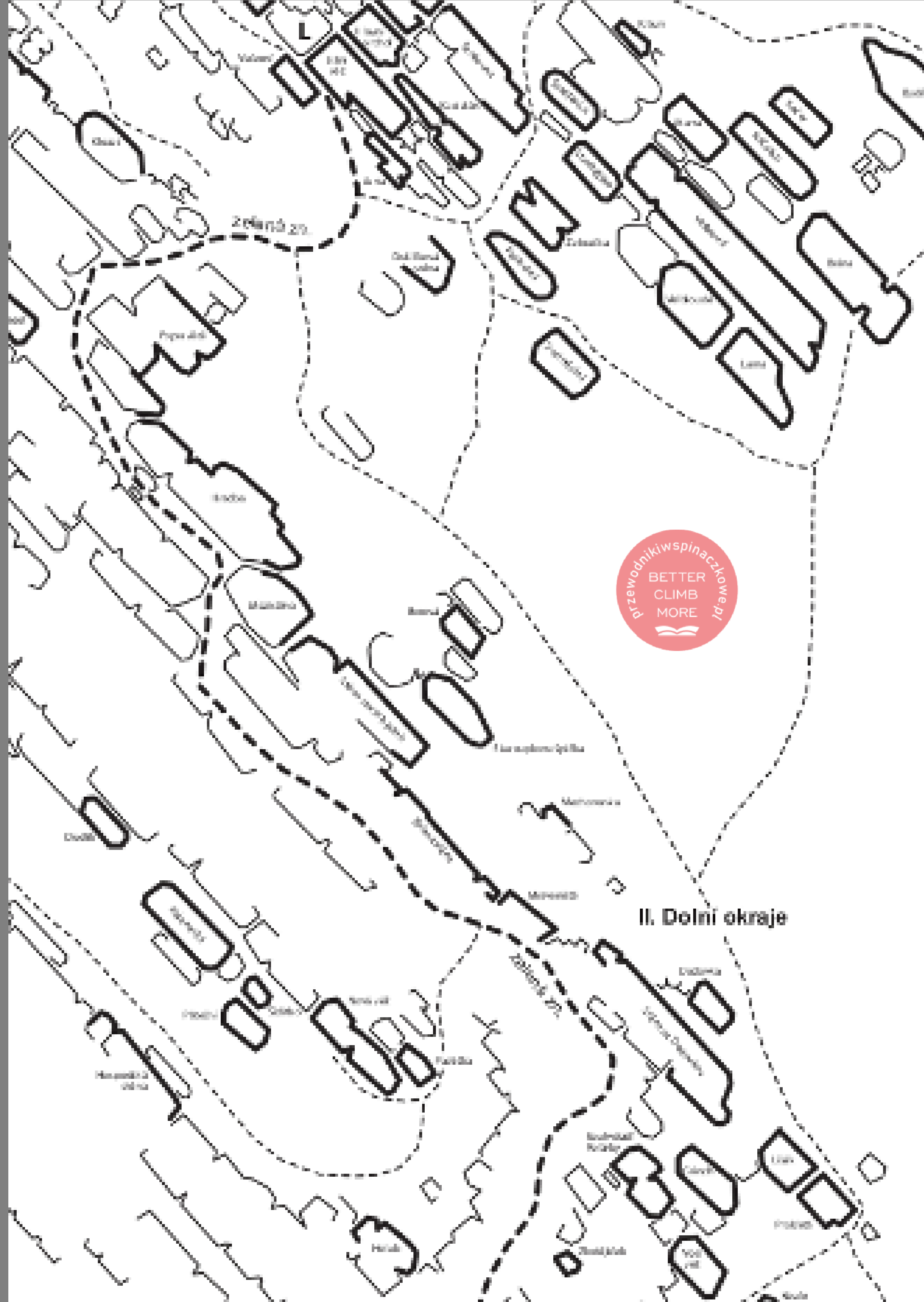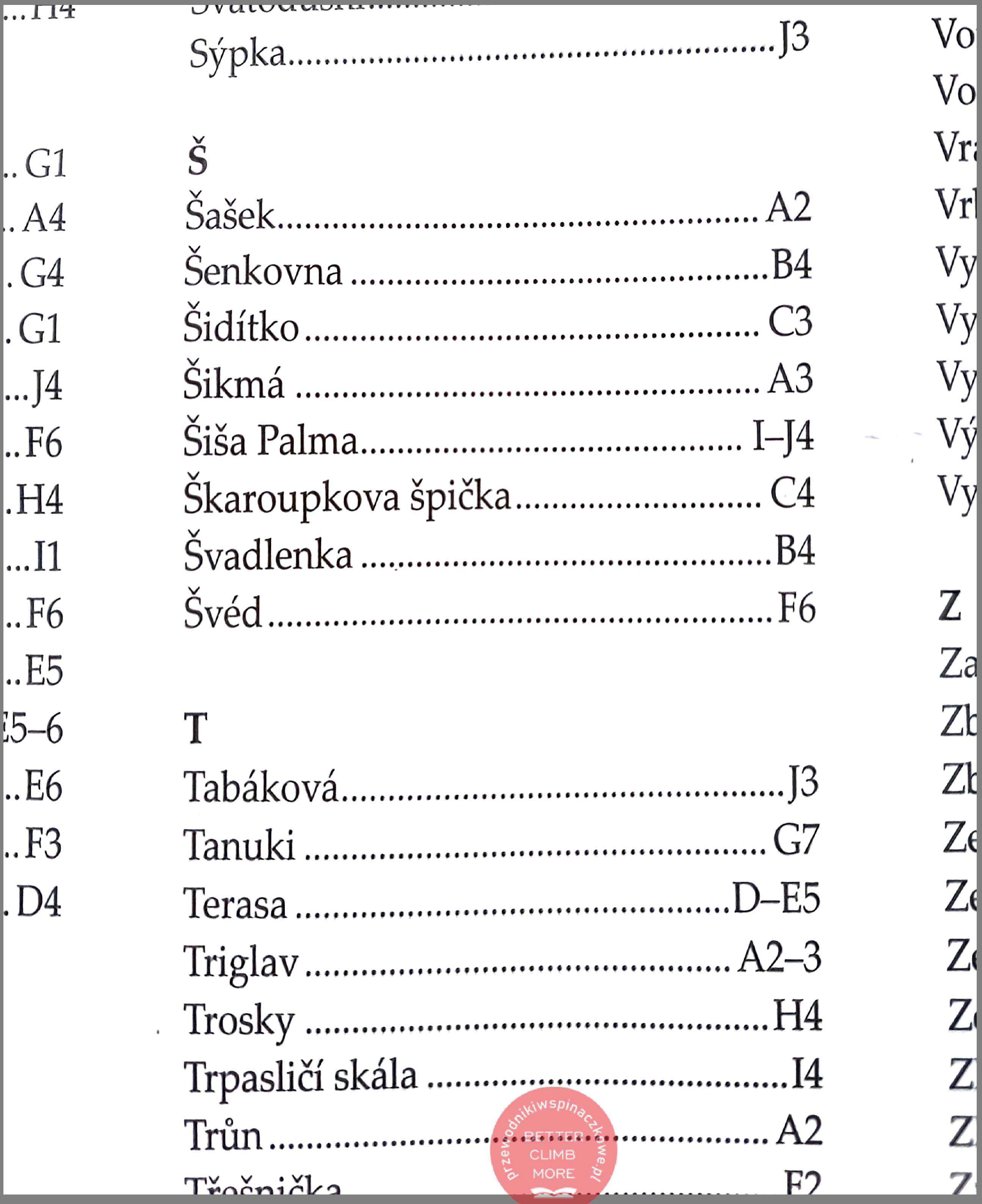 Obejmuje wszystkie wieże opisane w przewodniku wspinaczkowym Adolfa Kadleca. Na planie zaznaczono ścieżki dojścia do poszczególnych rejoników, wyszukiwanie konkretnych skałek ułatwia alfabetyczny indeks.