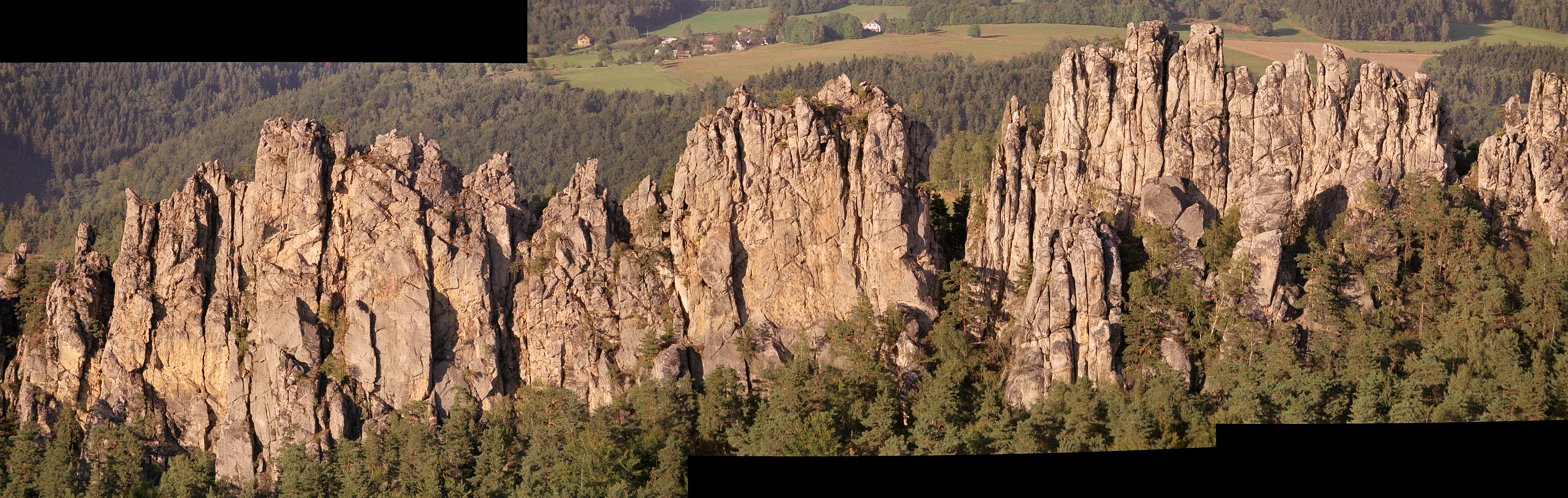 Tytułowe Suche Skały to potężna, piaskowcowa formacja tworząca "grzebień" o długości ok. 600 metrów i wysokości dochodzącej aż do 100 m. Z powodu swojego spektakularnego wyglądu czasami nazywane są „czeskimi Dolomitami”.