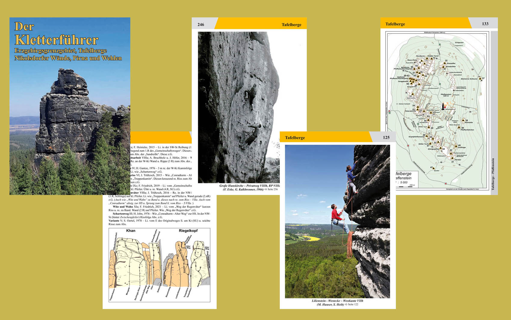Przewodnik wspinaczkowy Kletterführer Tafelberge in der Sächsischen Schweiz mit Erzgebirgsgrenzgebiet, Nikolsdorfer Wänden sowie Pirna und Wehlen przedstawia serce piaskowcowego rejonu Saksonii Szwajcarskiej w Niemczech przy granicy z Czechami. Przewodnik podzielony jest na cztery główne rejony: pogranicze Gór Rudaw (Góry Kruszcowe, niem. Erzgebirge, czes. Krušné hory), ściany Nikolsdorfer Wände, okolice miasteczka Pirna oraz Wehlen.